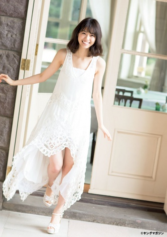 清純ガールの代名詞ともいえる白いレースのワンピースをはじめ、ふんわりとしたパステルイエローやカラフルな小花柄のワンピースを着こなし。デコルテラインやスラリとした美脚を披露するなど大人っぽい一面を発揮し、ニットキャップ&パーカというカジュアルなスタイルでアクティブな印象も見せている。『月刊ヤングマガジン』4号表紙カット