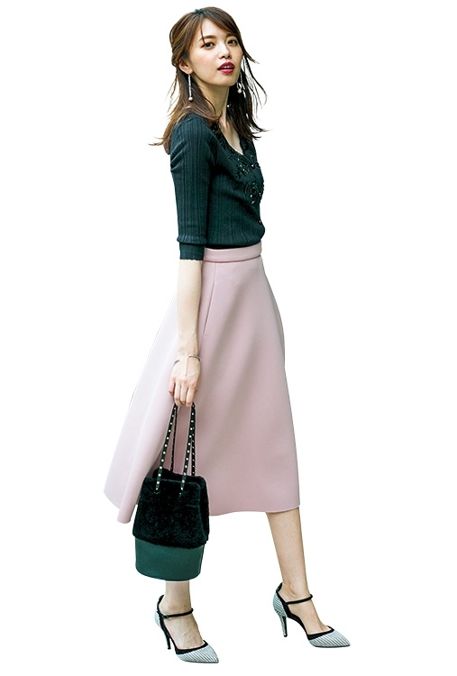 ■バイカラーのパンプスは、スカートに馴染ませつつ黒で引き締め!