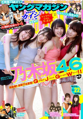 热烈推荐2017春夏05-02報道:人気アイドルグループ・乃木坂46が、5月1日発売の『週刊ヤングマガジン』第22号(講談社)の表紙と全グラビアページをジャックした。同グループの『ヤンマガ』グラビアジャックは、昨年12月12日発売の第2/3合併号以来、わずか4ヶ月ぶり。人気の選抜メンバーから次世代を担う3期生まで、総勢11人のメンバーが登場する。